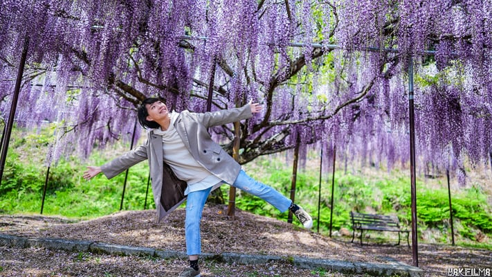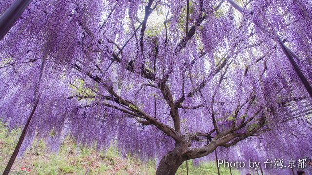 放眼望去,長長的花穗隨風起舞,有如淡紫色瀑布一般流瀉而下的九尺藤,每年總讓白毫寺湧入大批遊客,是人氣觀光景點。