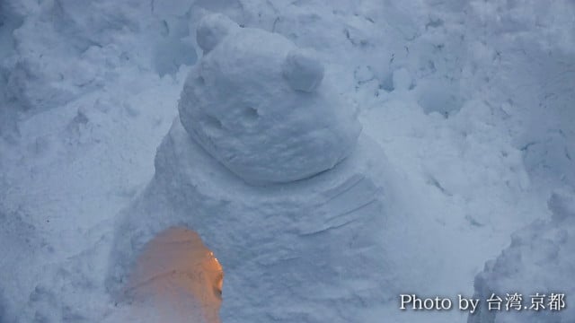 首先排隊領了免費的工具體驗製作雪燈籠。製作方法非常的簡單,用水桶裝滿雪之後弄得紮實一點再倒出來,下方挖空放入蠟燭、點火就完成基本款的雪燈籠囉!今年因為雪量夠豐沛,大家都卯足全力在完成自己的作品呢!